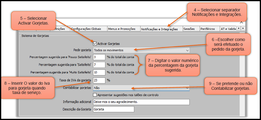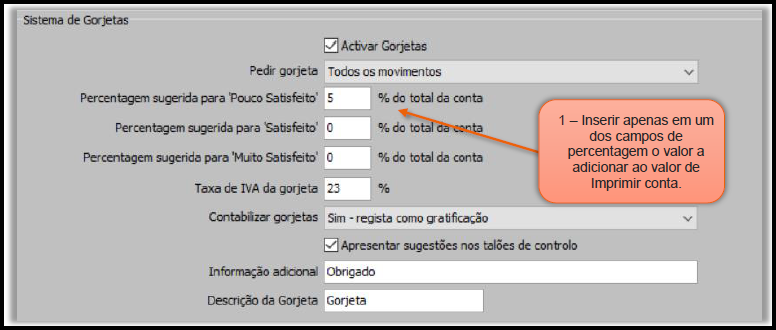 - No quadro do Sistema de Gorjetas selecionar a check box Activar Gorjetas;