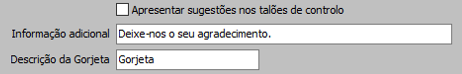- Ao selecionar a check box "Apresentar sugestões nos talões de controlo", vai inscrever a informação das sugestões para gorjetas no Talão de controlo (CM):