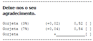 - Nos campos para as percentagens sugeridas “Pouco satisfeito”, “Satisfeito”, ou, “Muito satisfeito”, o utilizador deve digitar o valor numérico em percentagem a apresentar no documento como gorjeta;