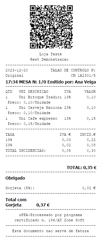 - Inserir apenas num dos campos das percentagens o valor a adicionar ao documento quando se efetua o pedido de Imprimir Conta, “Consulta de Mesa”. Os outros dois campos devem estar definidos com o valor a zero;