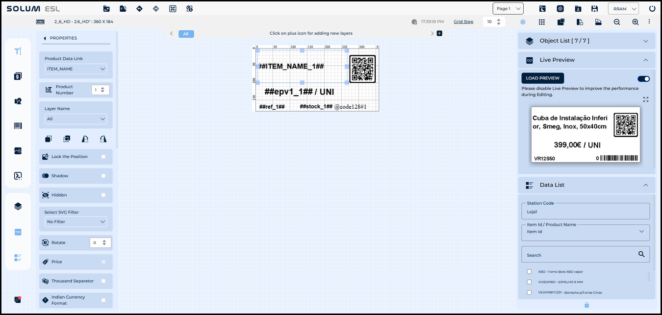 No Menu à direita, na opção "Data List" e "Live Preview" utilizando um artigo criado em sistema, consegue pré-visualizar e verificar o estado da etiqueta.