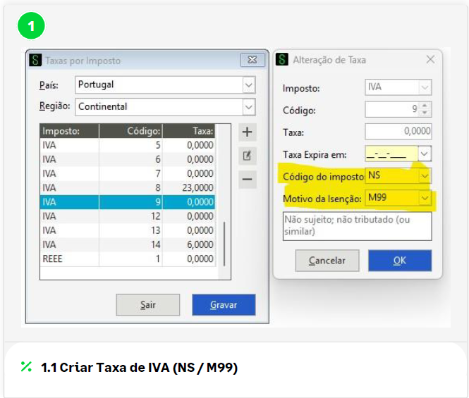 - Associar a taxa IVA código (NS/M99)