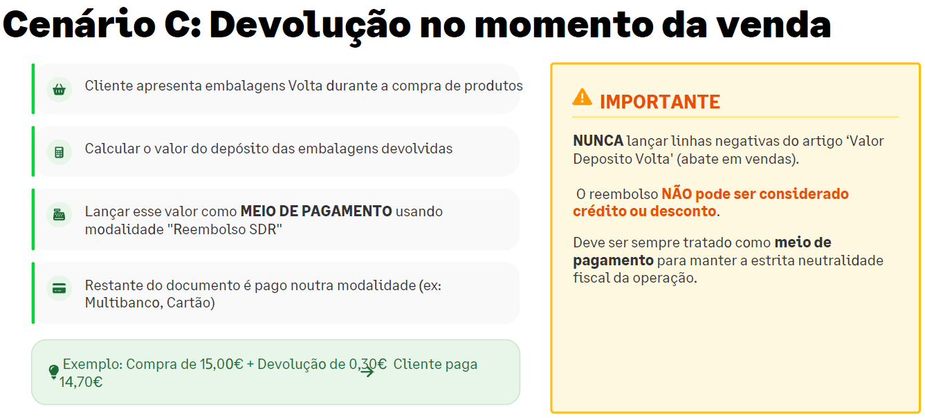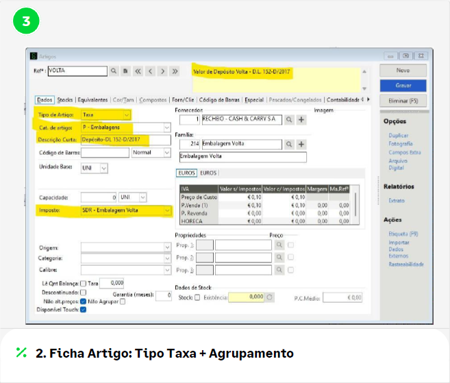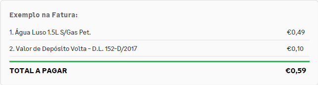 - Efeito: Ao vender 1 unidade, o depósito de 0,10€ é lançado automaticamente.