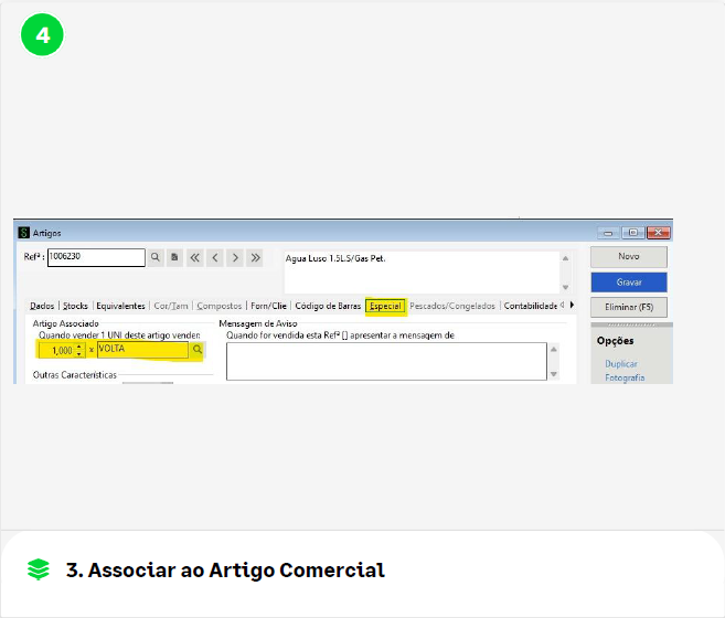 - Abrir a ficha do artigo comercial (Ex: Água Luso 1.5L);